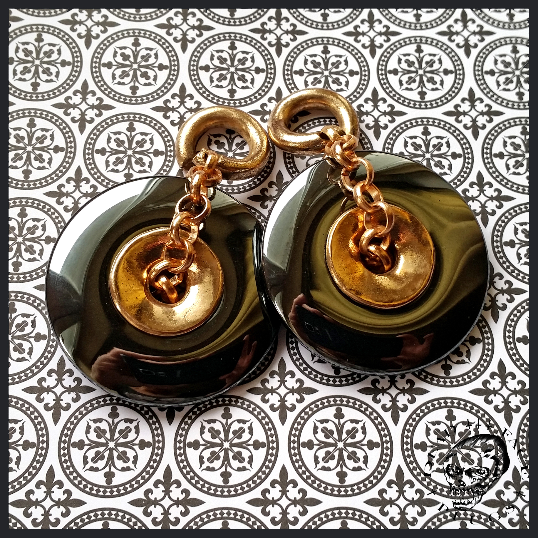 Shiny hematite donuts finished with bronze decorative elements.