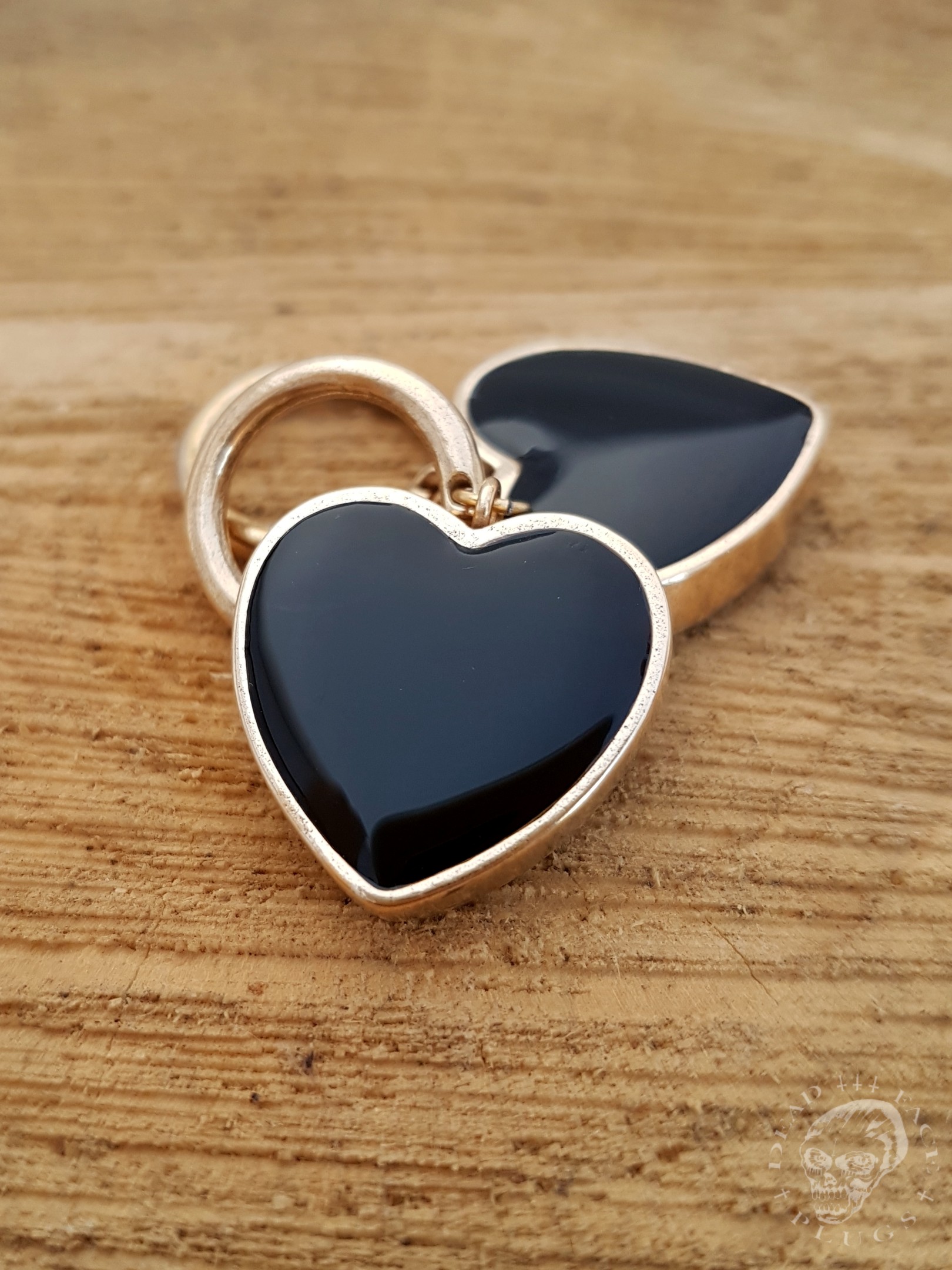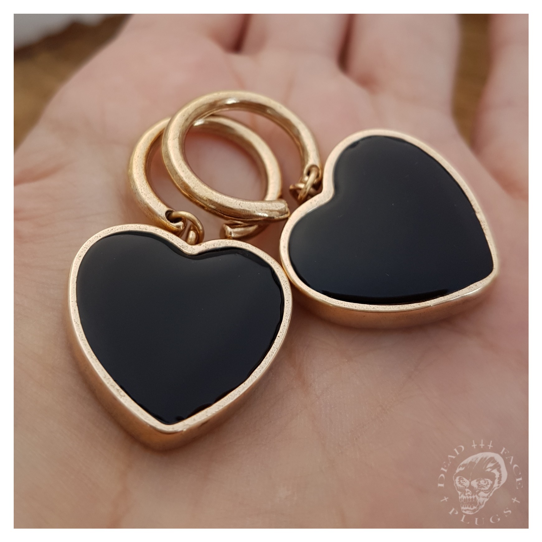 Wide golden heart-shaped frames filled with thick black smoke. Handmade bronze hoops.