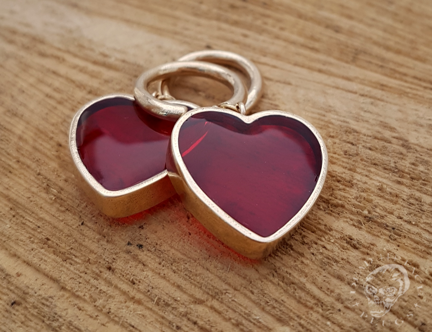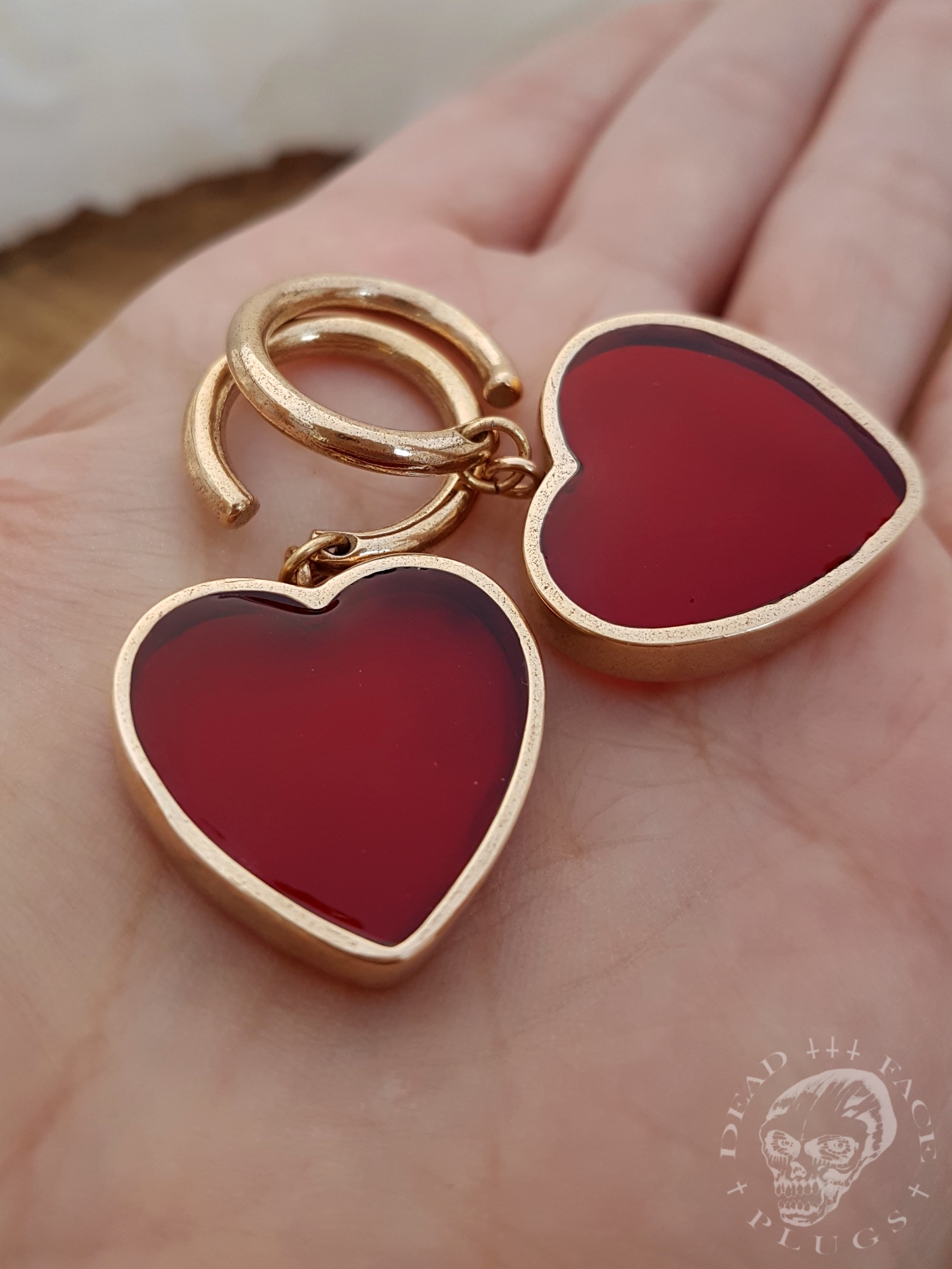 Wide golden heart-shaped frames filled with sweet raspberry syrup. Handmade bronze hoops.