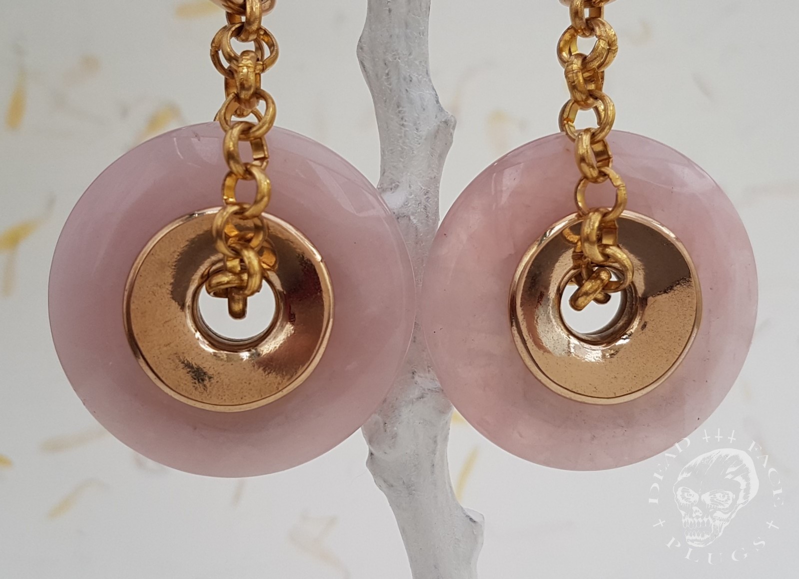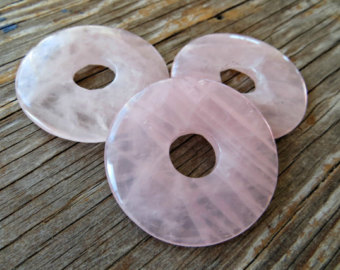 Sweet and rosy quartz donuts finished with bronze decorative elements.
