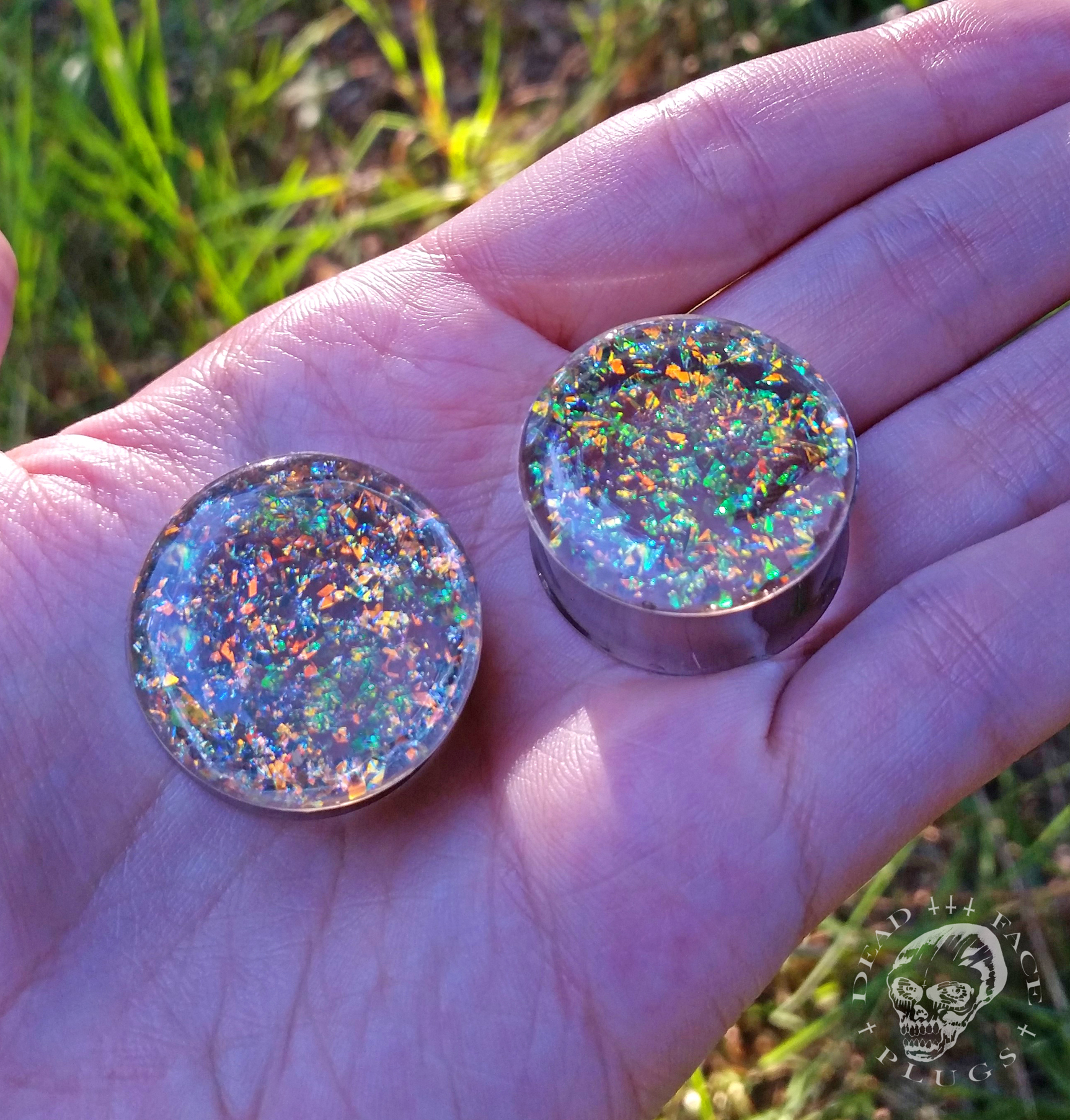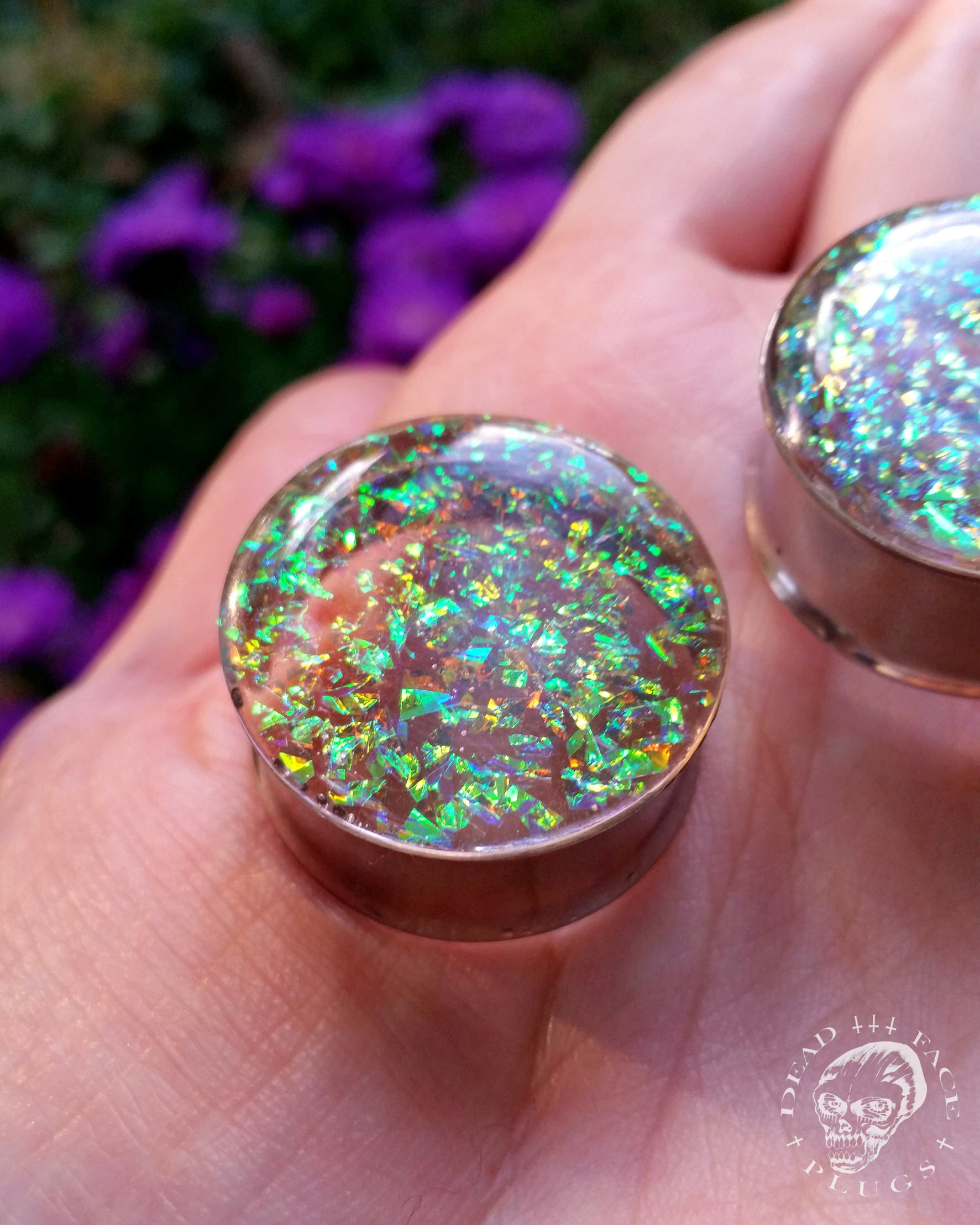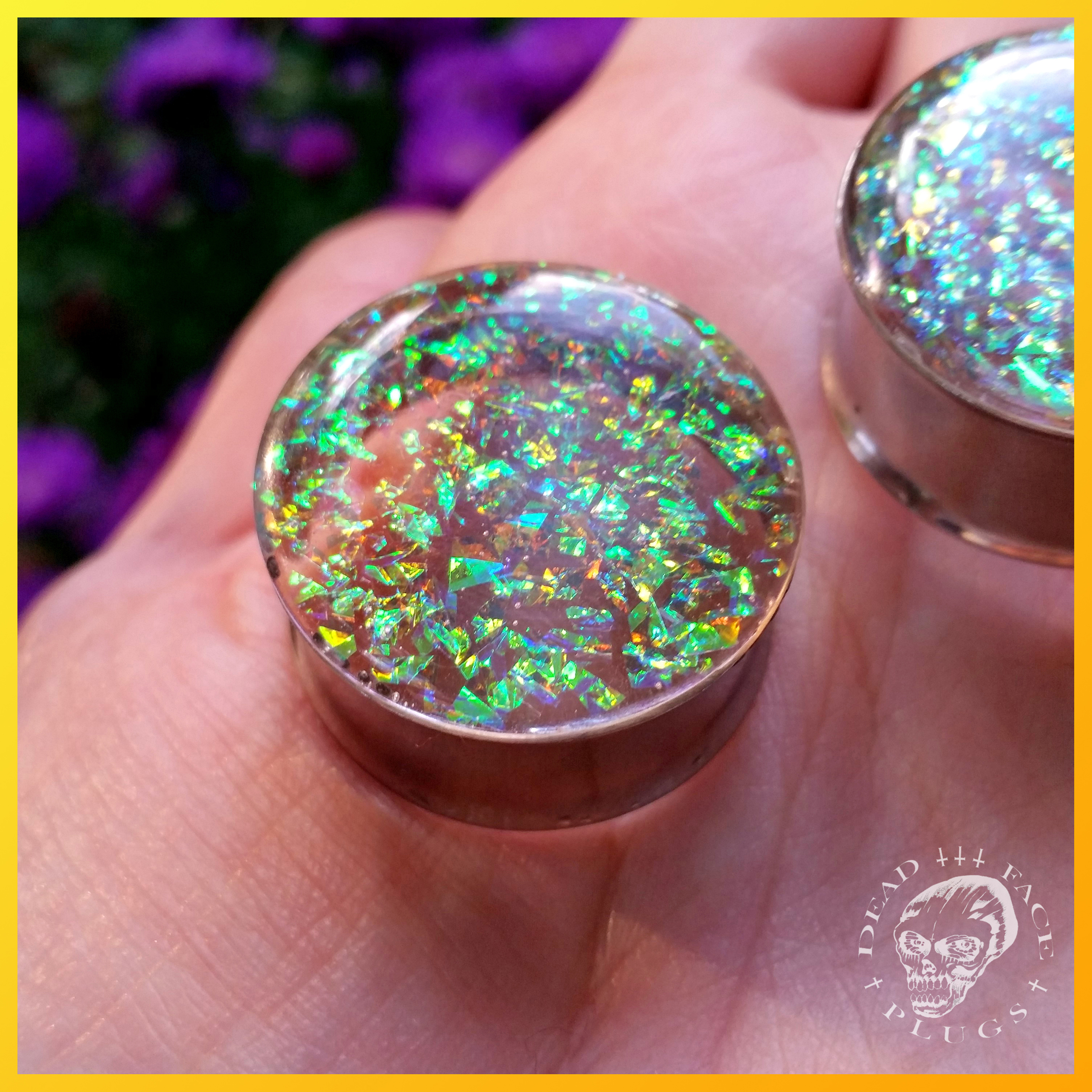 Dichroic glass looking plugs sparkling in colors: yellow to orange and lime green, leaf green and light sapphire.