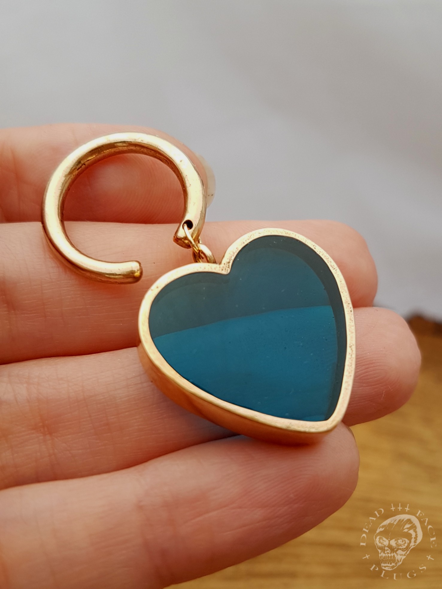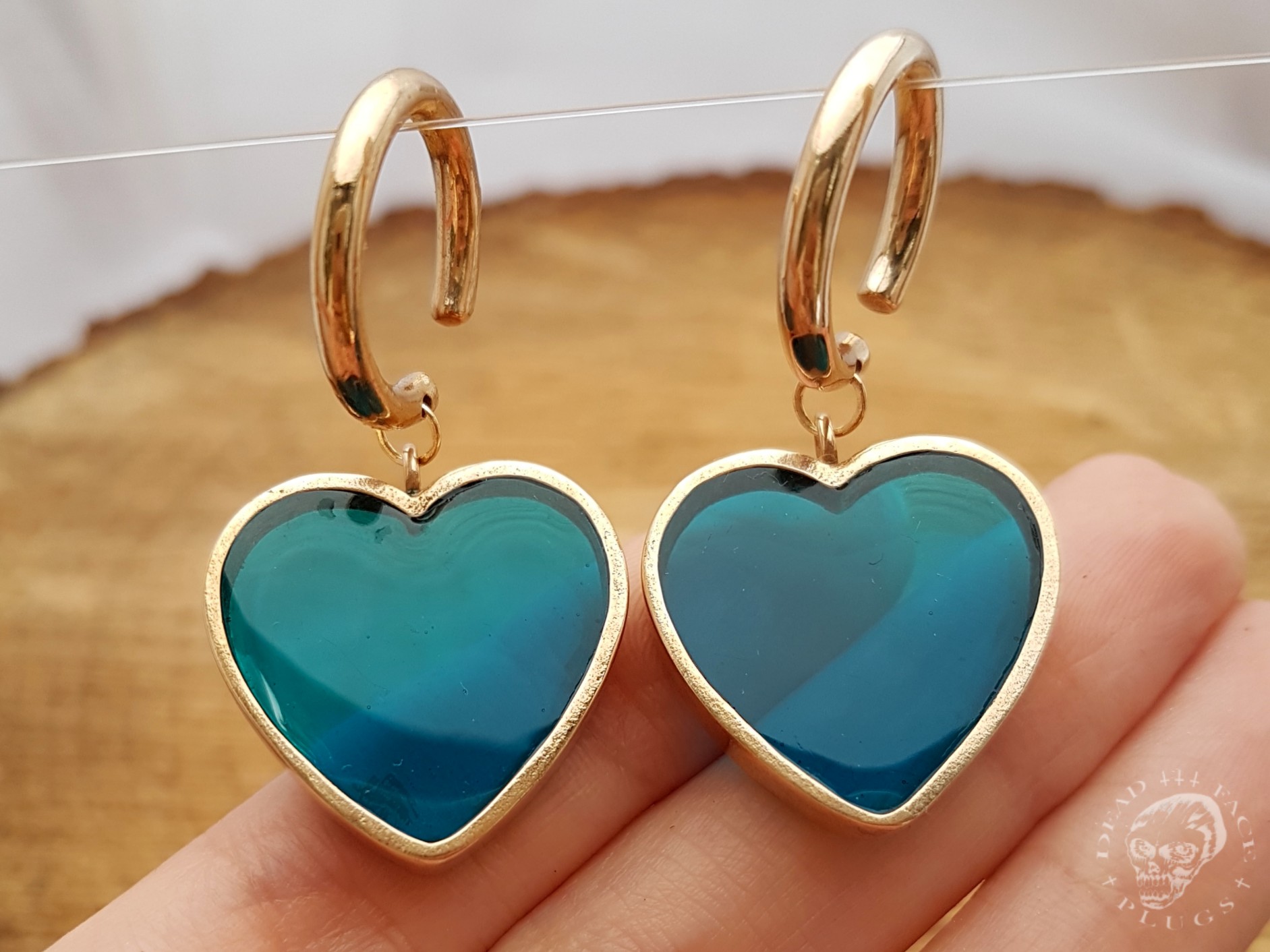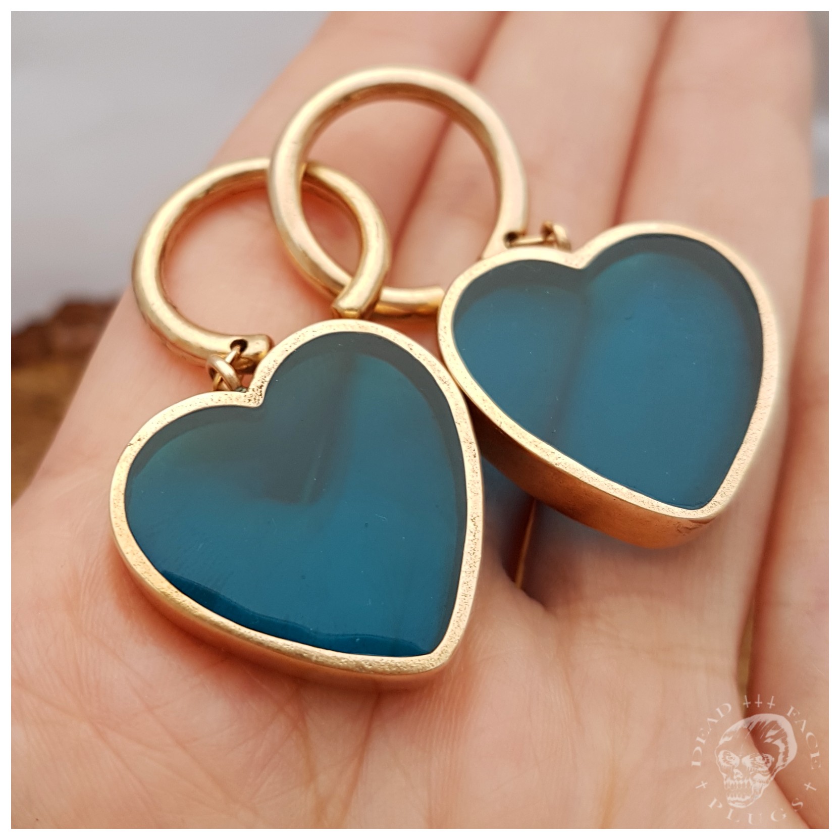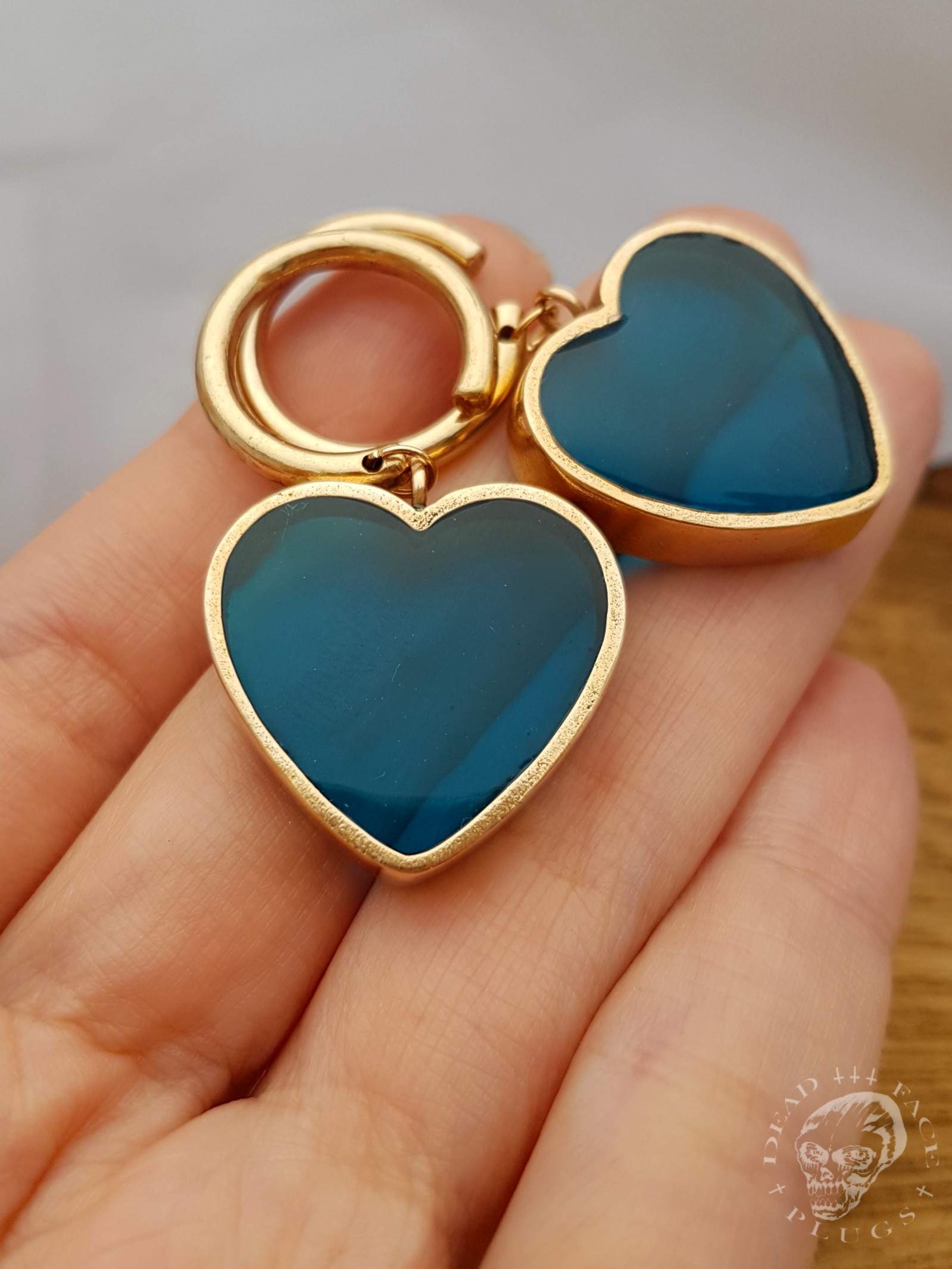 Wide golden heart-shaped frames filled with a deep blue glow. Handmade bronze hoops.