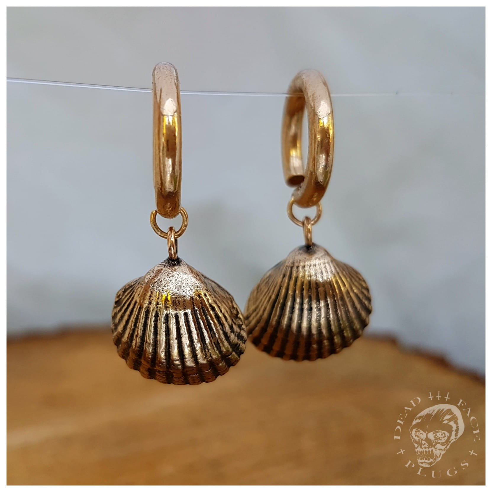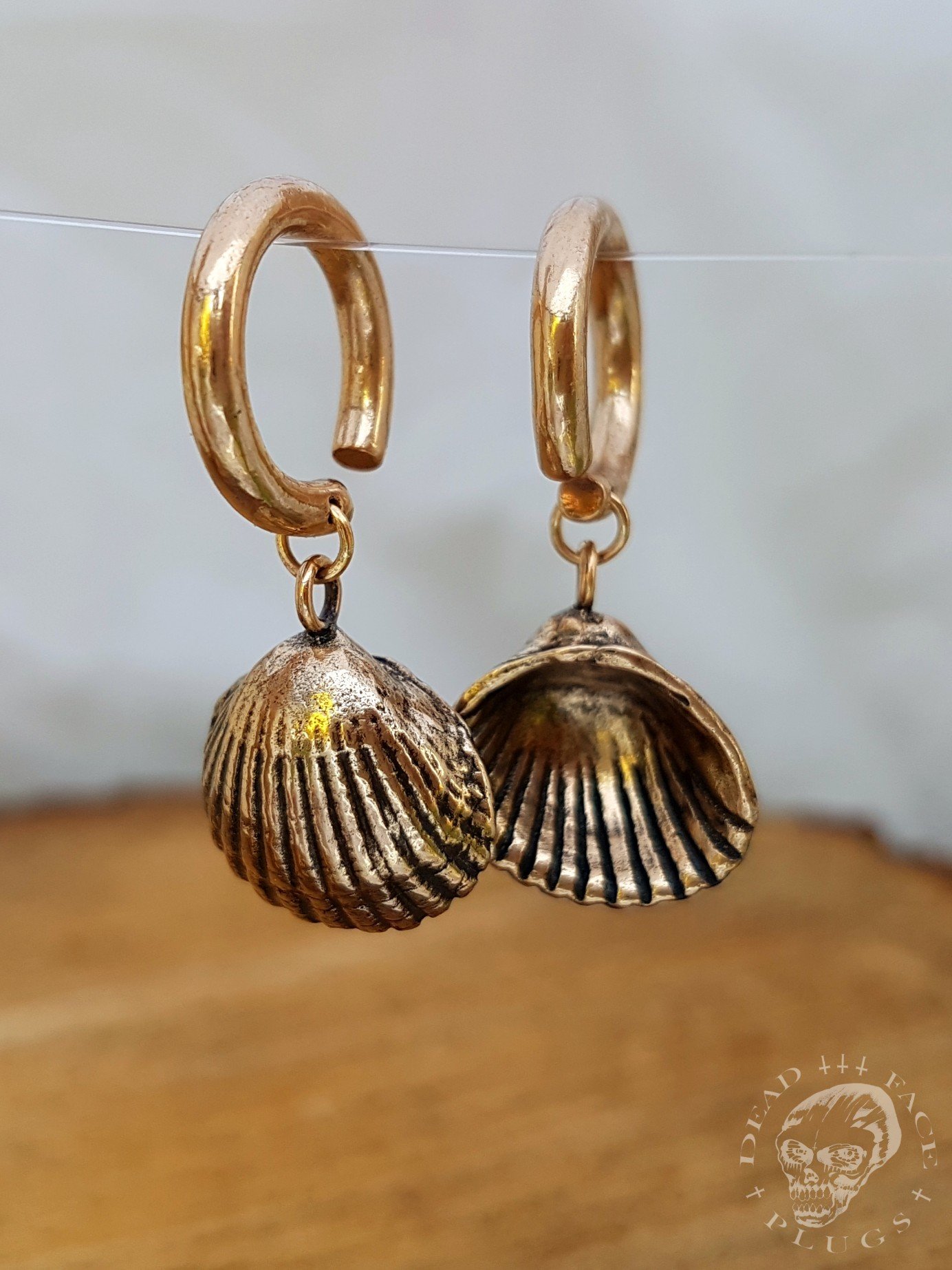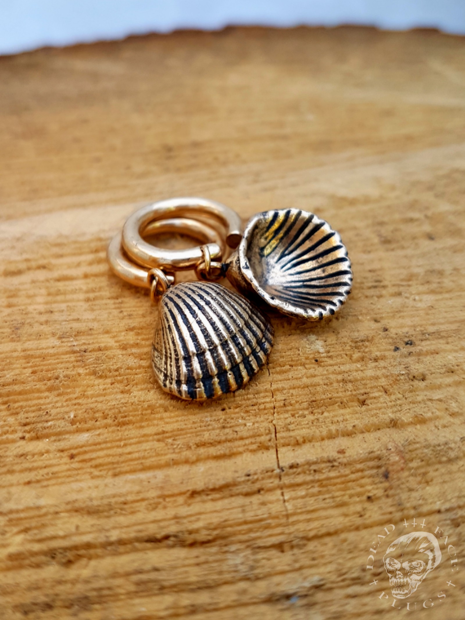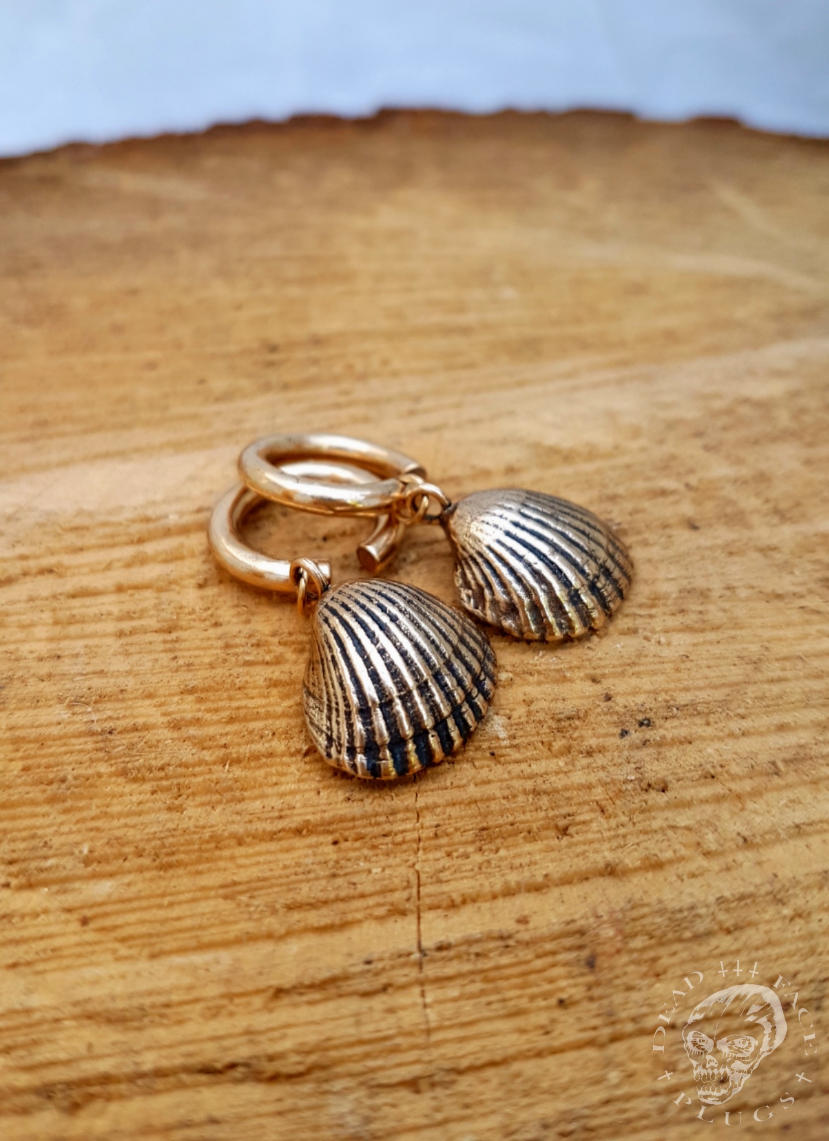 Delicate and light weights-earrings for stretched ear lobes. Perfect copies of Baltic cockleshells collected by me on the seashore. Made of bronze and hung on a small hoops.