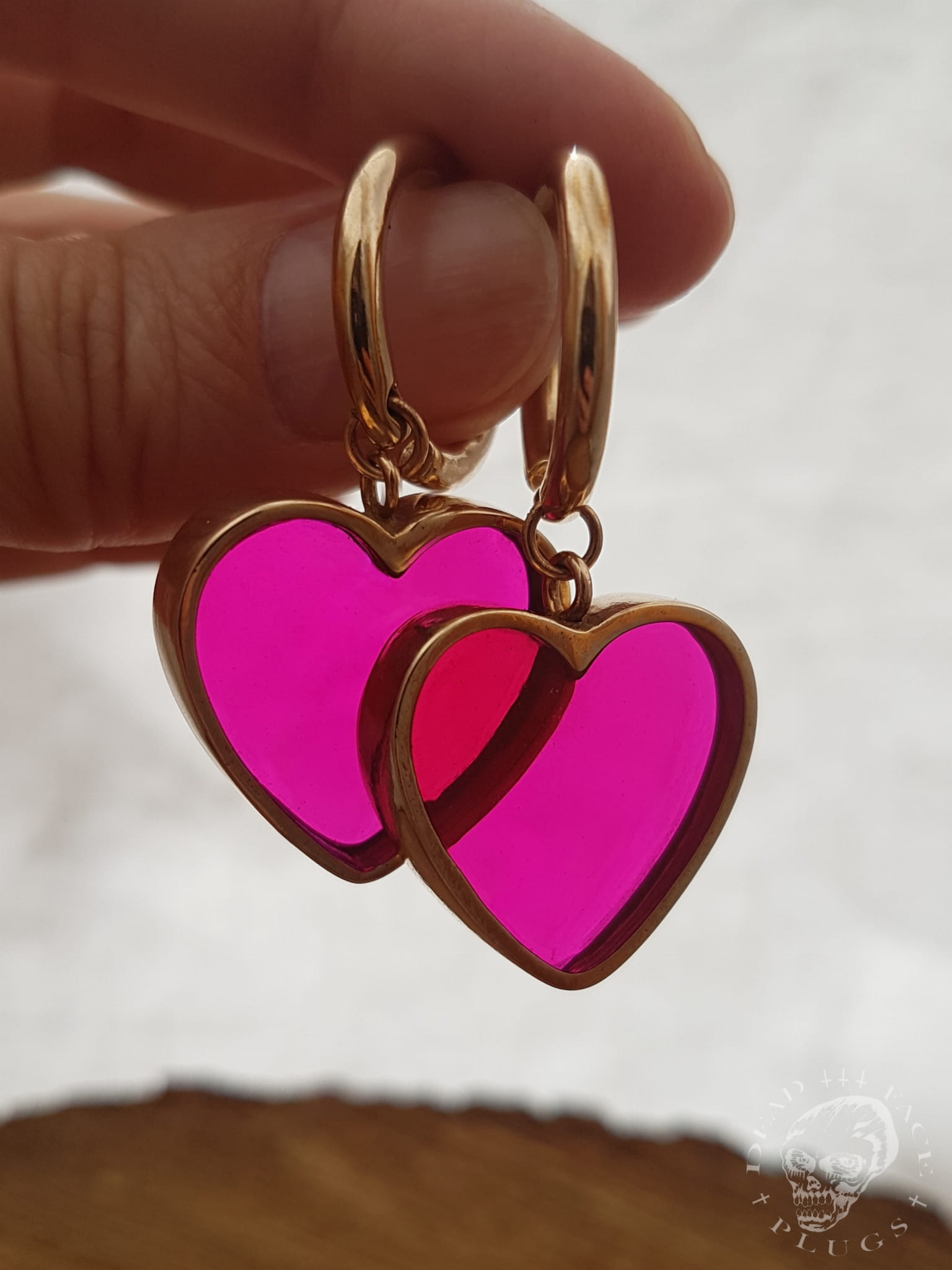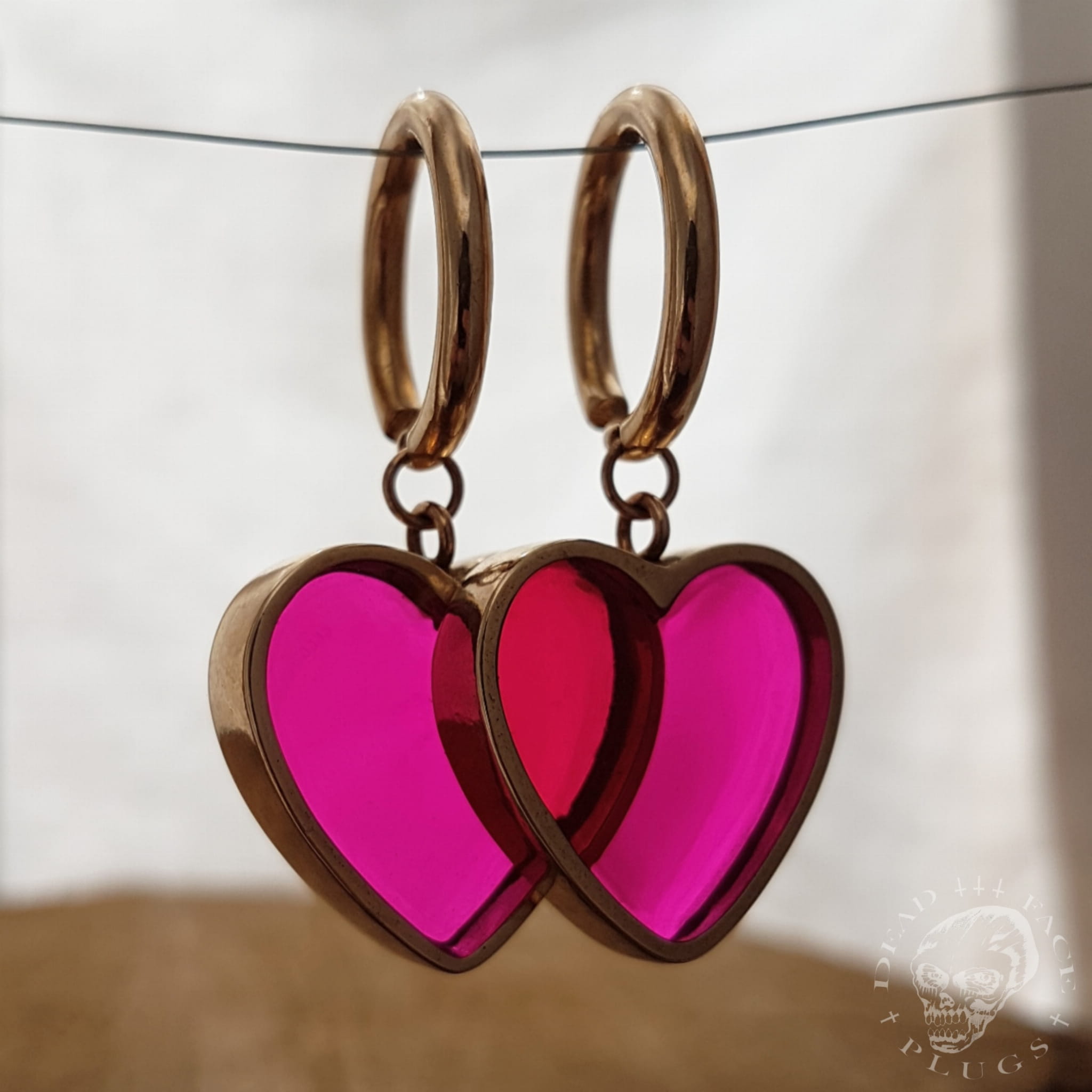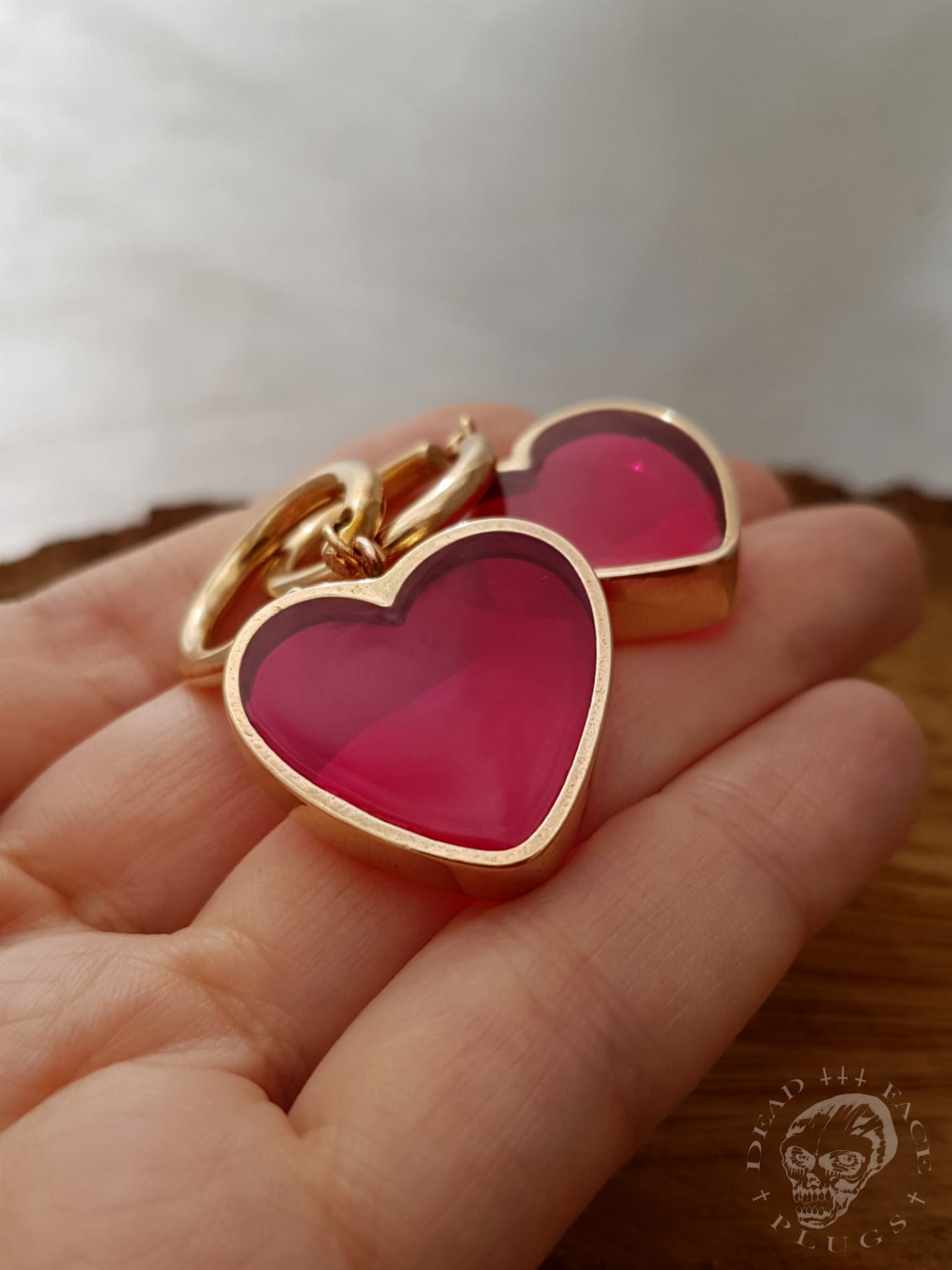 Wide golden heart-shaped frames filled with magenta pink colored resin. Handmade bronze hoops.