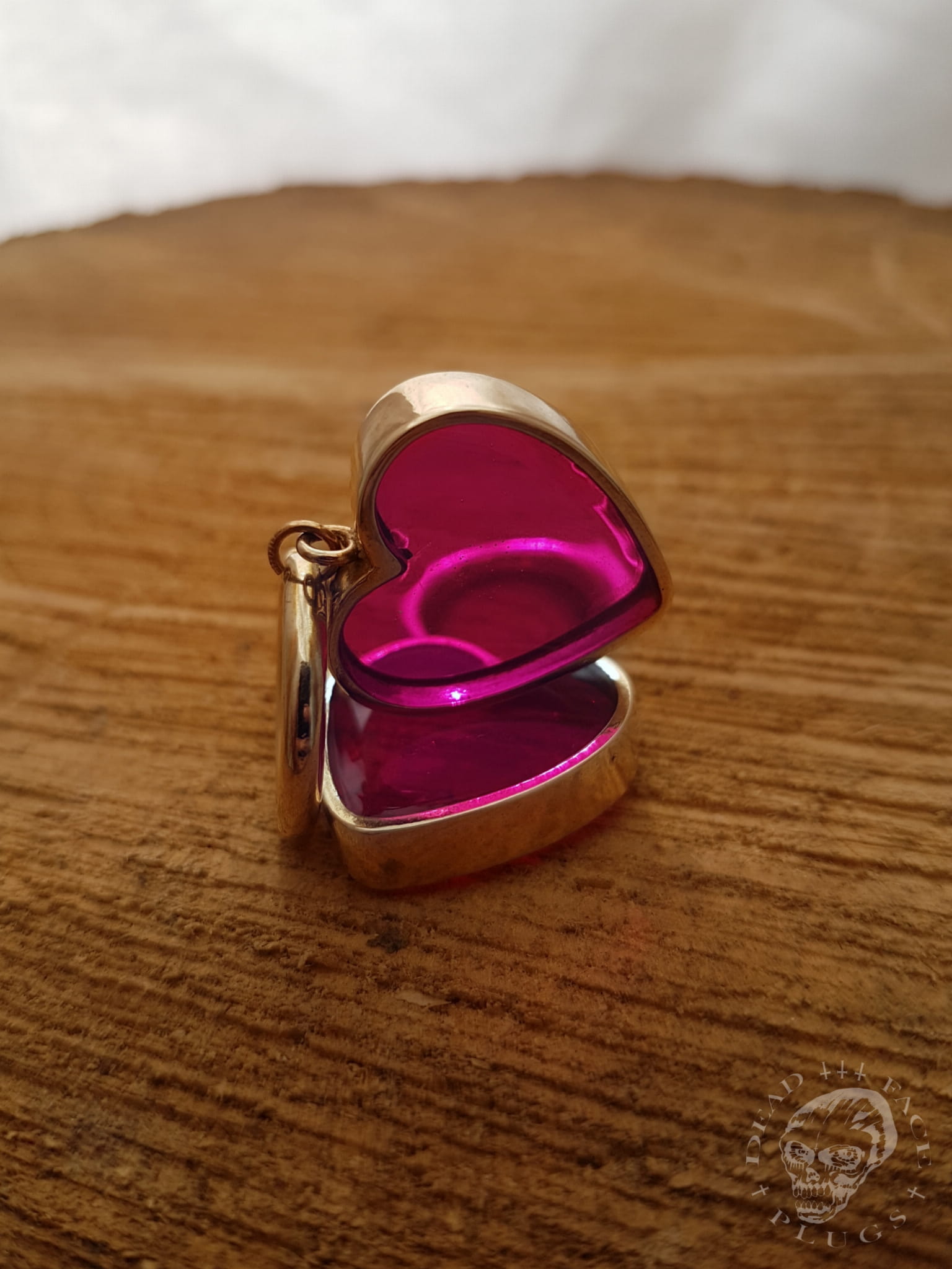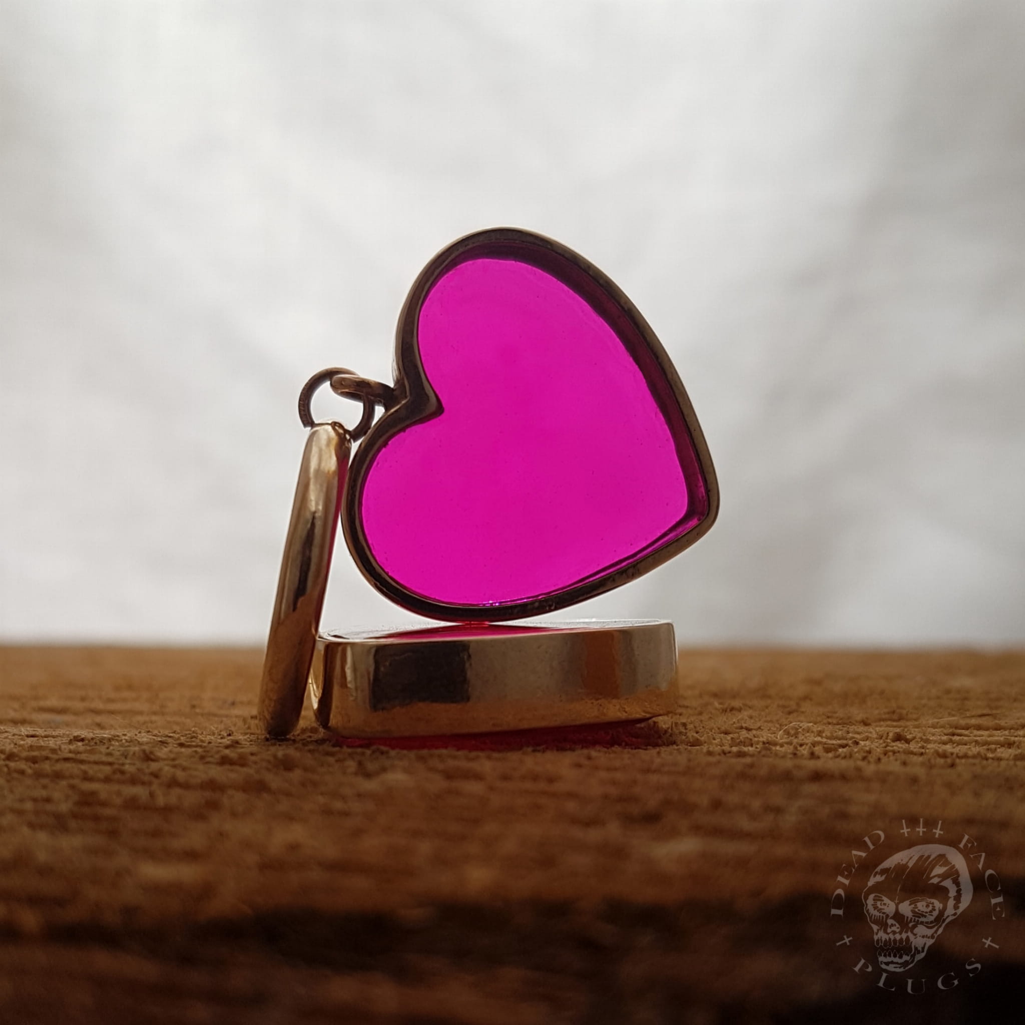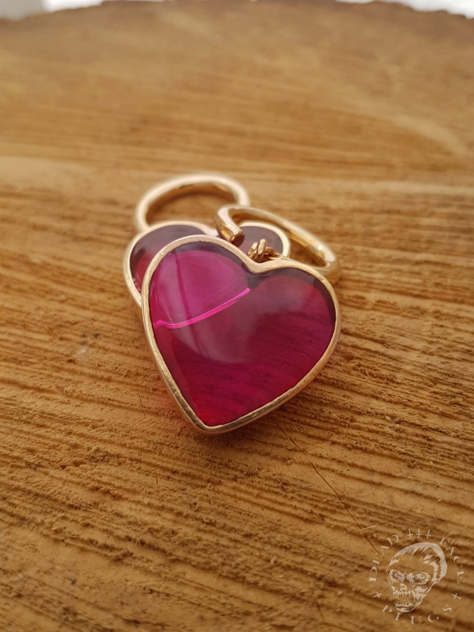 Wide golden heart-shaped frames filled with magenta pink colored resin. Handmade bronze hoops.
